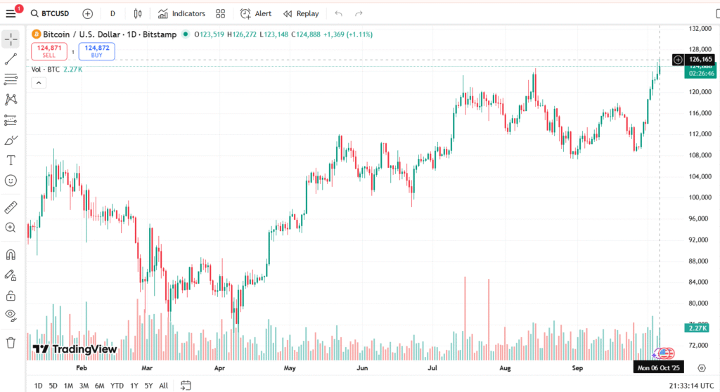 Bitcoin (BTC) has once again captured the crypto world’s attention, surging to an all-time high of $126,198.07 on Bitstamp. The one-day chart from TradingView reveals a dramatic upward trajectory, with the price climbing from a low of around $92,000 in mid-year to its current peak. This 1.11% increase, coupled with a trading volume of 2.27K BTC, underscores a robust bullish sentiment that has dominated the market since June.