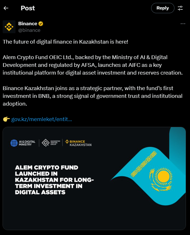 Strategic partnership with Binance Kazakhstan kicks off with an initial BNB allocation, boosting the token’s legitimacy in state reserves.