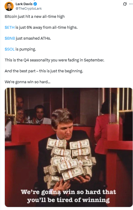 The cryptocurrency market is ablaze as analyst Lark Davis (@TheCryptoLark) heralds a powerful Q4 rally on October 6, 2025, at 07:54 PM +04. In his latest X post, Davis celebrated Bitcoin hitting a new all-time high, with Ethereum (ETH) just 6% away from its peak. Binance Coin (BNB) has smashed its all-time highs (ATHs), while Solana (SOL) pumps aggressively. This surge, Davis argues, reflects the seasonal strength of the fourth quarter, a trend he says skeptics doubted in September. With an optimistic tone, he declares, “This is just the beginning,” fueling excitement among traders and investors.